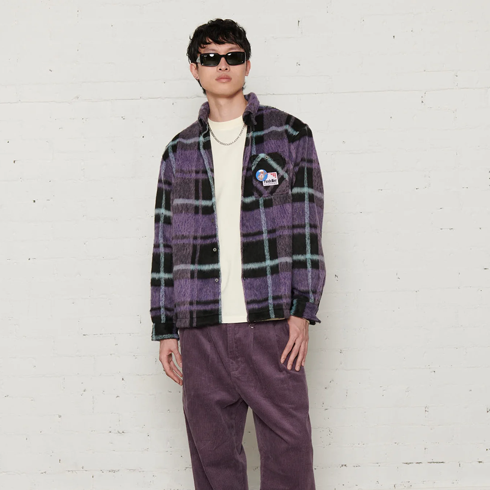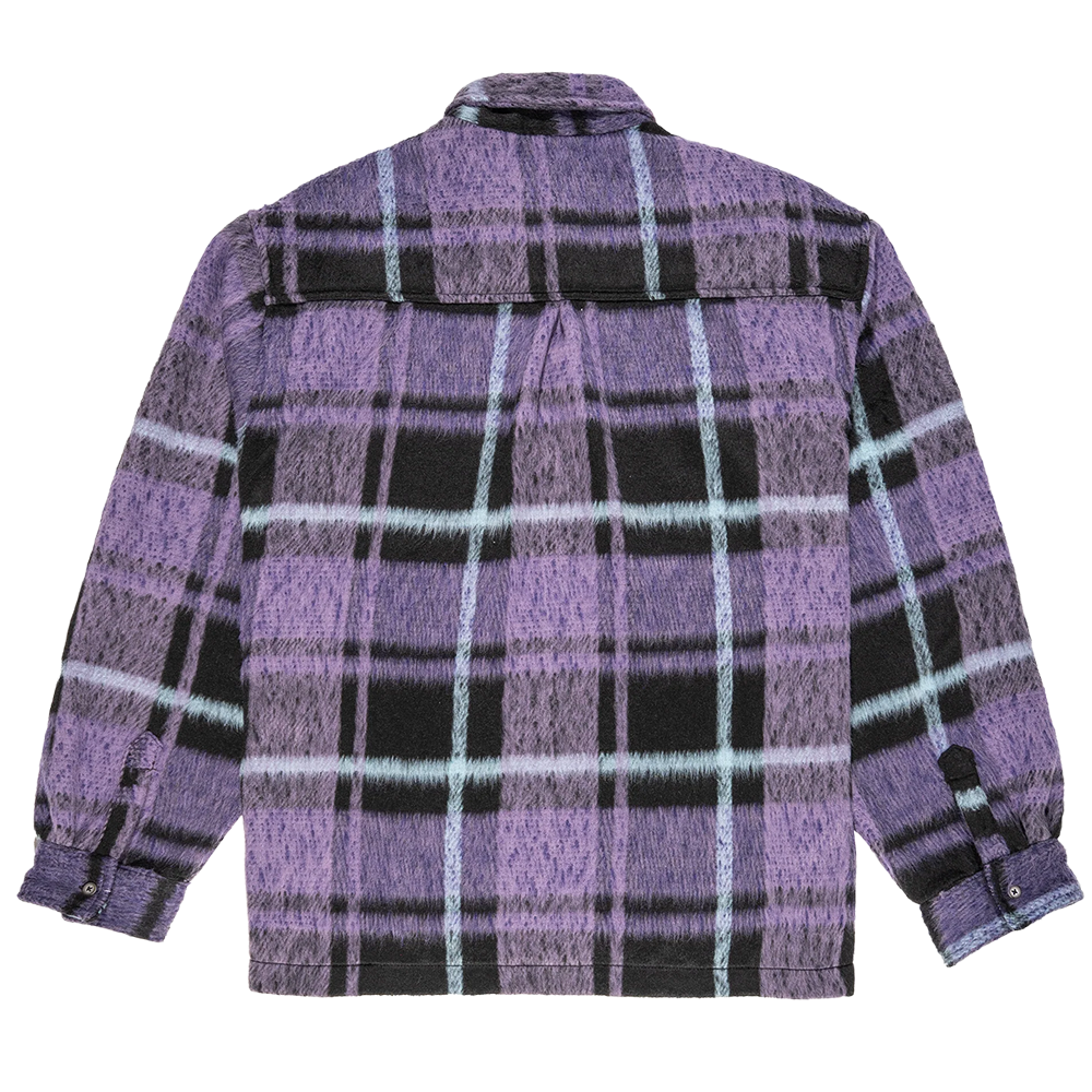 Viola/Nero. Finitura spazzolata morbida, pensata per un capo da indossare a strati di grande impatto per la stagione.