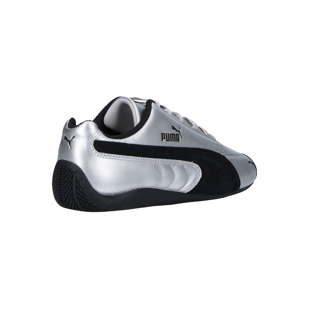 SNEAKERS "SPEEDCAT METALLIC" PUMA, IN PELLE ARGENTATA, PUNTA TONDA, DETTAGLIO RICAMO LOGO, CHIUSURA LACCI, LOGO IMPRESSO SU LINGUETTA, INSERTI NERI LATERALI, LOGO IMPRESSO LATERALE, LOGO SU TAB RETRO, SUOLA IN GOMMA.
