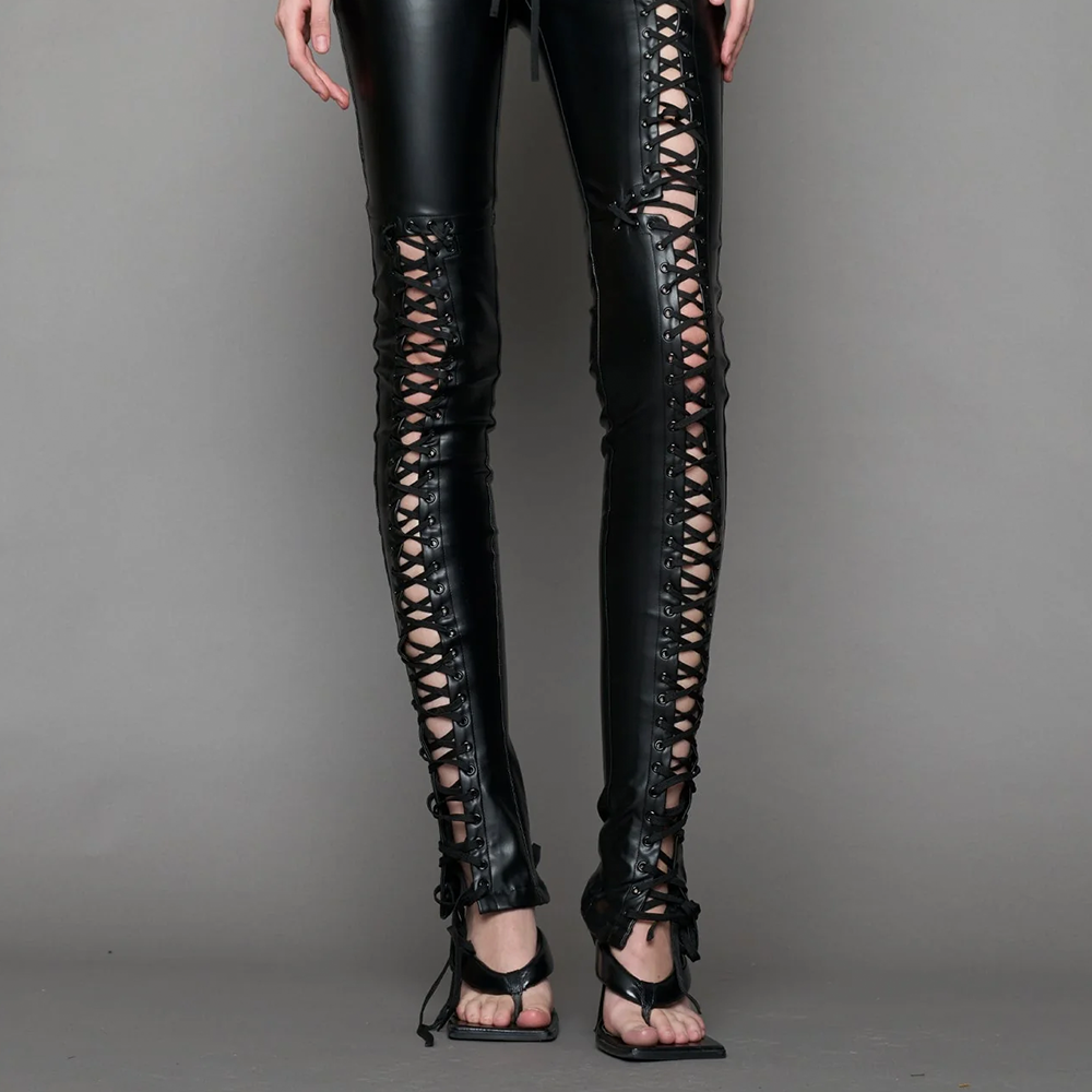 Pantaloni neri in PU elasticizzato con allacciatura asimmetrica e regolabile